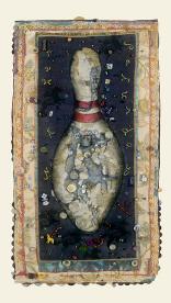 In my work, I use fabric from a variety of sources, including antique quilts and vintage clothes, and sew them by hand with a variety of interesting and fun artifacts.