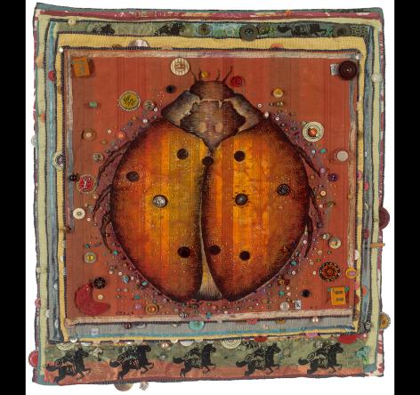 Highly detailed, hand painted ladybug on batiked patterned fabric, layered and embellished with beads, buttons and bottlecaps.