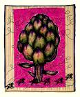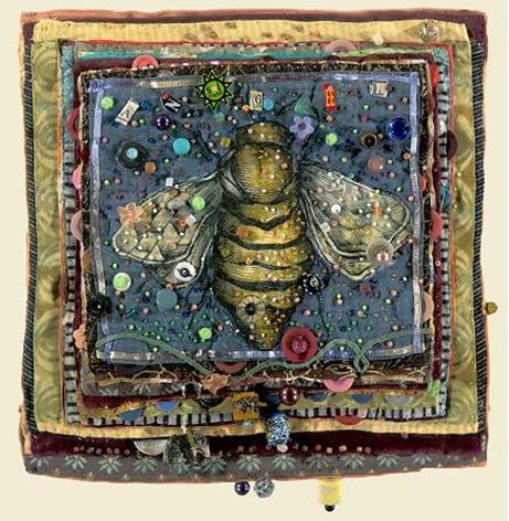 Very elaborate hand painted, batiked bee on highly decorated layered fabric embellished with beads, buttons, tin cutouts and bottlecaps. Original is approximately 10” x 10”.