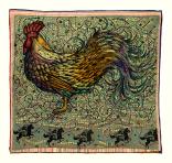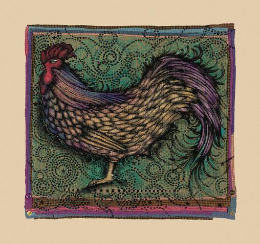 Intricately painted rooster on wax-resisted, layered dyed fabric.