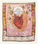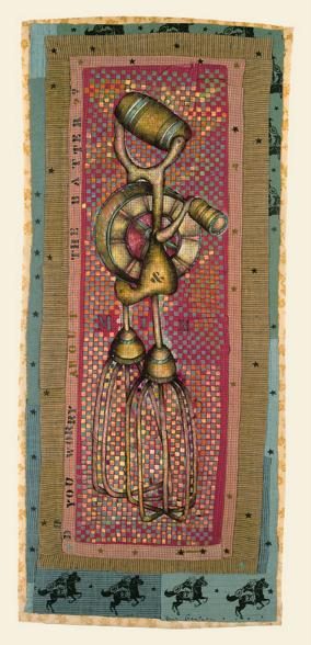 The original is 18” x 40”, hand-painted, batiked vintage hand mixer on quilted, hand-painted background with stenciled cowgirls. Part of a private collection.